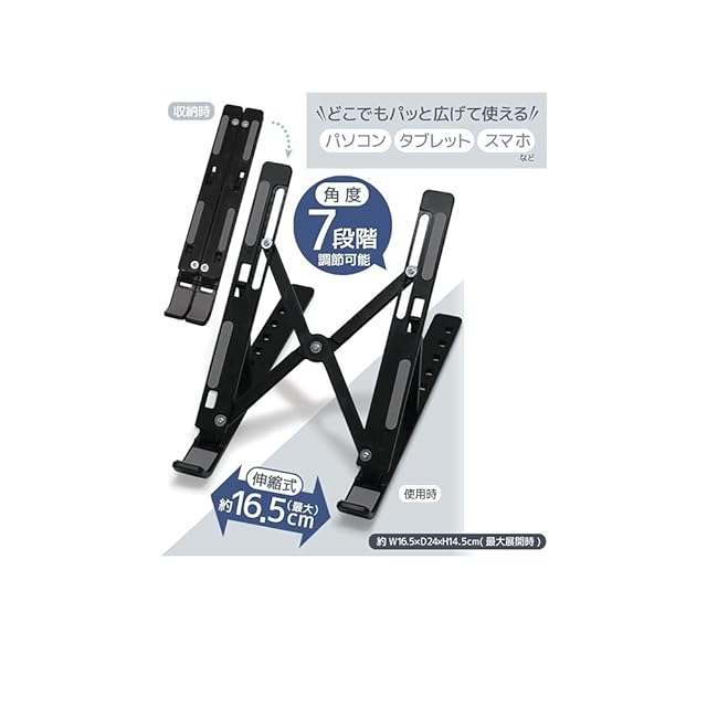 ●ご利用用途 : ノートパソコン、タブレット、スマホ、本、冊子、楽譜など。対応サイズの目安は14インチ程度まで ●横幅は外寸4.5~16.5cmの範囲で伸縮可能です。 ●角度は7段階(高さ5.0~14.5cm)で調整可能です。 ●重量約105gと超軽量、コンパクト設計なので外出先への持ち運びも楽々です。 ●角度調節をすることで体への負担軽減が見込めます。また、パソコンの熱気対策としてもご利用頂けます。