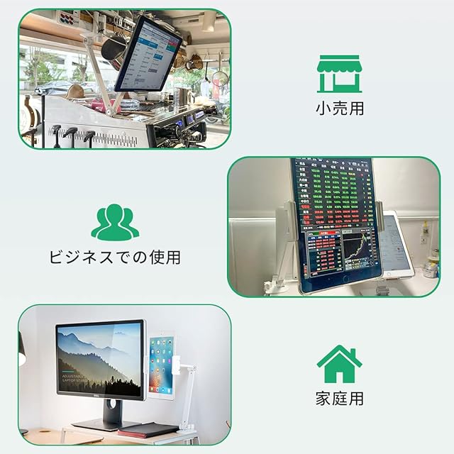 【4.7~15.6インチ対応】タブレット スタンドのホルダー部の長さは12.5~22.5㎝まで伸縮できるので、スマートフォン、タブレットなどに使えるほか、15.6インチまでのモバイルモニターにも使えます。ディスプレイタブレット、iPadまたはiPhoneにまとめてフィットします。レストランショップ、オフィスホームデスクトップなどで一般的に使用される大小のタブレットPCにぴったり合います。 ※ご注意:15.6インチのモニター用に購入される場合、ベゼルを含めたモニターの幅(外寸)を必ずご確認ください!幅22.5cm以内は対応可能です。
