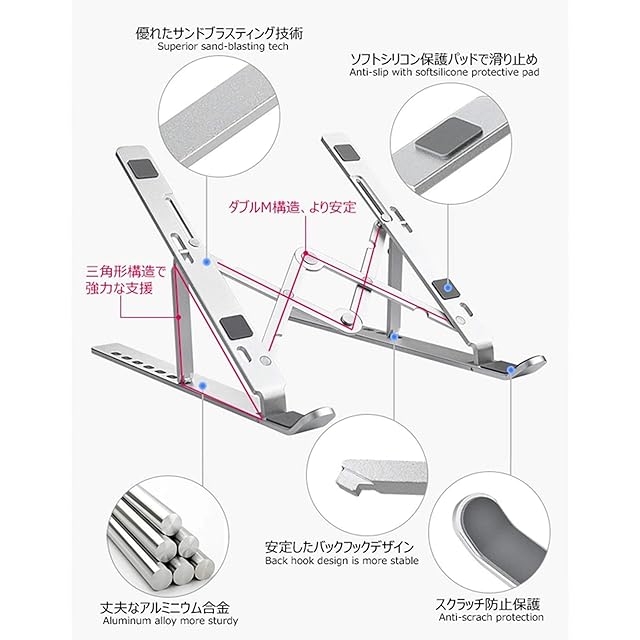 【滑り止め&安定性抜群】滑り止めシリコンパットはスタンドの上面や裏面に付いているので、PCを全面的な保護できるではなく、デスクなどの接触する面も保護できます。アルミニウム合金製三角形デザインのため、安定性が高い。耐荷重は30KGで、様々なパソコンの重量を耐えられます。