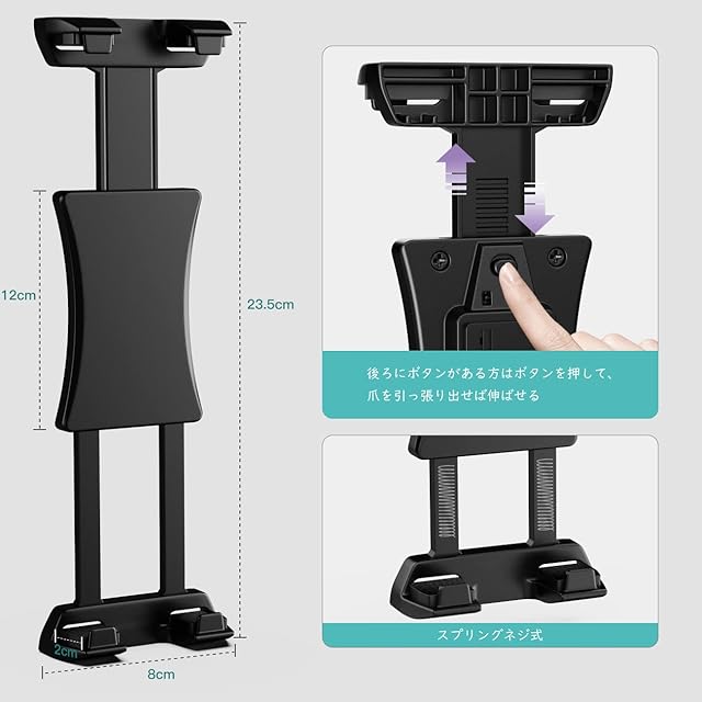 「幅調整可能」 本ブラケットの幅は機種によって、12cm-23.5cmの範囲内で自由に調整できます。後ろにボタンがある方はボタンを押して、爪を引っ張り出せば約7cm伸ばせます。反対側はスプリングネジを利用し、手を離すと自動的に戻すタイプで、最大5cmくらい伸ばせて、デバイスに応じてお好きに調整できます。