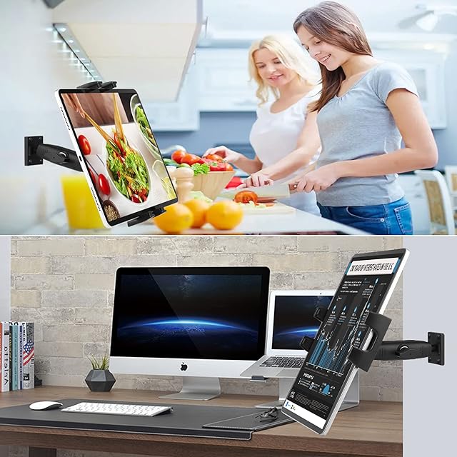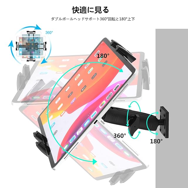 【任意の角度で見る】タブレット壁掛けマウントには4インチの長いアームと2つのボールヘッドが搭載されており、双方向に360°回転することができます。これは、水平、垂直、顔の上下または傾斜など、任意の角度に調整して快適に見ることができることを意味します。これにより、生き生きとしたビューをキャプチャし、視認性を高め、よりよく働くことができます