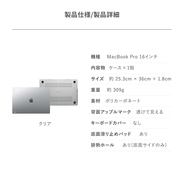 【製品特徴】… ◆ 背面アップルマーク : 透けて見える ◆ キーボードカバー : なし ◆ 底面滑り止めパッド : あり ◆ 排熱ホール : あり(底面サイドのみ)