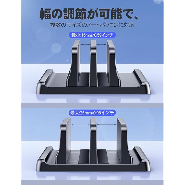 【調整可能な幅】この垂直ノートパソコンスタンドの幅は調整可能で、各種ノートパソコンと互換性があり、各スロット間の厚さは15mmから25mmまでさまざまで、あなたの設備の安全なフィットを確保します!