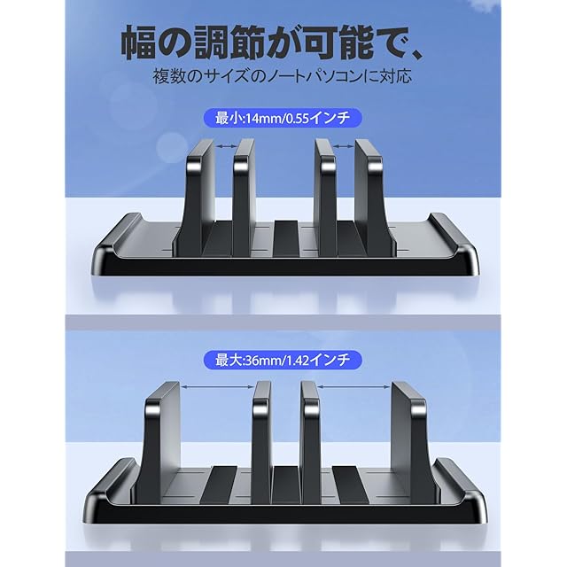 【調整可能なスロット幅】この調整可能なラップトップスタンドには、小さなアランキーが付属しています。 これを使用して、ミドルホルダー間のスペースを調整できます(0.55インチから1.57インチ)。したがって、各スロットの幅をカスタマイズして、任意のデバイスの厚さに合わせることができます。 間にスペースを空けてラップトップを保持することも、良好な空気循環を確保できます。