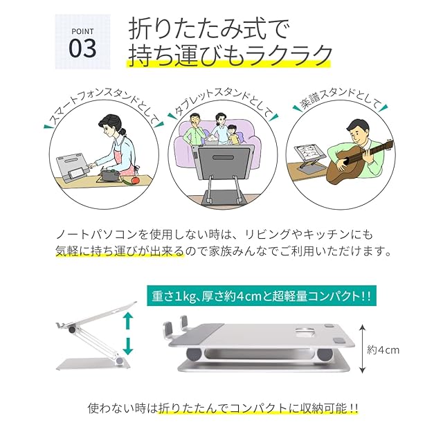 [ 製品仕様 ] サイズ: W27cm x L21cm x H4cm (折りたたみ時) 重量:1kg 材質:Alminium Alloy (本体), シリコンパッド [ 製品保証 ] 安心のメーカー1年保証 [ 対応パソコン(一例) ] Macbook Air 13 / Mackbook Pro 13 / Macbook Pro 15 / Macbook Pro 16 Lenovo ThinkPad E595 HP Pavilion 13 Lenovo Ideapad S540 Dell Inspiron 13/15, Vostro 15 HP ENVY x360 15 マウスコンピューター m-Book など (11~15.6インチ推奨) [ 製品保証 ] 安心のメーカー1年保証
