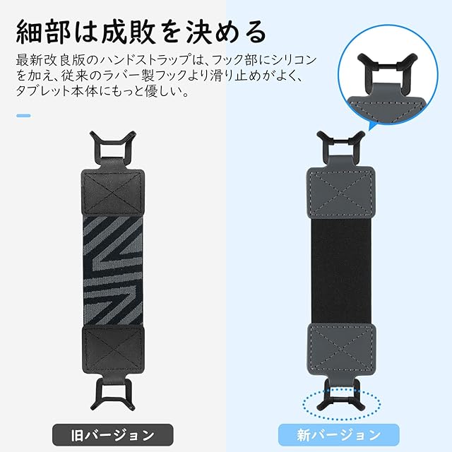 「上質素材採用」 優れた伸縮性がある弾力バンドを採用し、幅広い機種に対応でき、長時間使用しても緩みにくいです。上質なPUレザーを使用してフックの部分と丁寧に縫い合わせて、丈夫で引き裂けする心配は不要です。フックの部分はお客様のご意見を元に改良し、ラバー+シリコンの素材を採用し、タブレットに取り付けても大切な端末に傷つきませんし、滑り止め性能をより一層高め、安心してご利用いただけます。