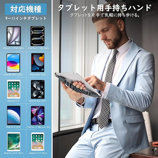 「対応機種」 伸縮性があるバンドを採用し、iPad Air 11 (M2) 2024、iPad Pro 11 (M4) 2024、iPad 10 10.9"、 iPad 9/8/7 10.2"、 iPad 6th 9.7"、 iPad Air 5/4 10.9"、iPad Air 3 10.5"、iPad Pro 11 2021/2020/2018、 iPad Pro 10.5" 2017、iPad Pro 9.7" 2016、Fire HD 10 & 10 Plus 2021など9~11インチまでのタブレットに適用します。両端のフック+弾力バンドの伸ばされていない状態下の全長は約18CMになりますので、ご購入の前に、お手元の端末の寸法を予めご確認ください。