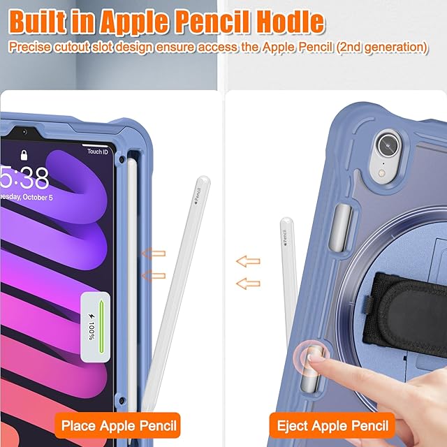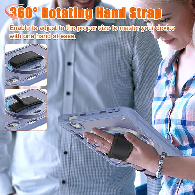 360度 回転 ハンドベルト iPad Mini 6 Mini 7 ケース 縦置き 横置き スタンド ショルダーストラップ付き iPad mini 第6世代 /iPad mini A17 Pro カバー 肩掛け 斜め掛け ペン収納 耐衝撃 TPU+PC 半透明カバー 頑丈 (紫灰) | AVENIR