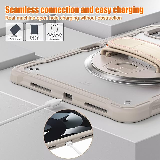 iPad Pro13 2024 ケース 360度 回転 ハンドベルト 縦置き 横置き スタンド ショルダーストラップ付き 頑丈 iPad Pro M4 13インチ タブレット カバー 肩掛け 斜め掛け ペン収納 耐衝撃 TPU+PC 半透明カバー,カーキ | AVENIR