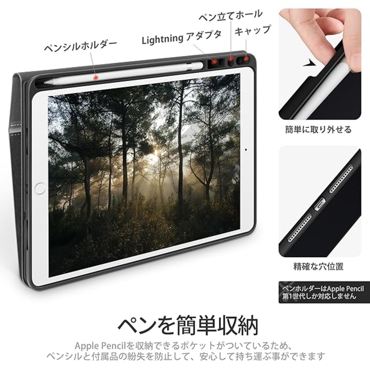 アップルペンシルは持っているけど収納場所に困った...<br> という経験はありませんか?<br> お客様からペンを「なくす、落とす」と言うお声を頂いて、この度アップルペンシル収納できるケースをデザインしました!<br> ペンシル収納できる以外はしっとりとした手触りで汚れ・指紋など目立たないような高級感のある材質になっています。液晶画面に触れる蓋の内側部分はクロス生地になっていて、iPad本体の画面が傷つくのを防ぎます。背面はTPUの採用で柔らかいため、iPadをもったときのグリップ・フィット感が向上します。 <br><br> 対応機種:<br> iPad 10.2 2021第9世代: A2602、A2604、A2603、A2605<br> iPad 10.2 2020第8世代: A2270、A2428、A2429、A2430<br> iPad 10.2 2019第7世代: A2197、A2198、A2199、A2200<br> サイズ(LWH):25.5×19×1.5(cm)<br> 重量:373g<br> <br><br> <b>[キレイを保つ]</b><br> 蓋の表面は優質なPUレザーを採用するため、iPadをもったときのグリップ・フィット感が向上します。<br>蓋カバーの内側は柔軟なPUレザーを使用し、柔らかい起毛で手触り感がよく滑り止め効果があります。スクリーンへの衝撃に強くて画面にも傷を付けません。<br><br> <b>[柔軟なTPU素材]</b><br> 柔軟で耐衝撃性高いTPU素材を使用したソフトケース。端末にしっかりフィットしてiPadを保護します。<br>ソフトケースは熱をためやすいため、ケース内側にパターンを彫り、端末とケースの密着を防止し熱の放出性を高めます。<br><br> <b>[ペンを簡単収納]</b><br> Apple Pencilがピッタリ入るペンホルダーがケースについており、 持ち運びにとても便利です。<br>横にある穴はペンスタンドとしてお使いいただき、紛失防止にも役だちます。<br>★ご注意:Apple Pencilは付属しておりません。ペンホルダーはApple Pencil第1世代しか対応していません。<br><br> <b>[正確な穴位置]</b><br> 精確なスピーカー穴カットアウト、隅々までカバーする保護して、大事なiPadにぴったりフィット!<br>ケースの部分は精密な加工を施し、フィット感抜群、iPadの取り出し時や収納時の摩擦によって発生するキズを抑えます。側面ボタンも押しやすい。<br><br> <b>[安定したスタンド]</b><br> 二段階のスタンド機能で安定性UP!<br>"立てる"と"寝かせる"の2つのパターンを状況に合わせて使い分け。<br>「見る」時は立てて、「描く」時は寝かせてのご使用がおすすめです。<br>最適な角度になるスタンド機能も利用でき、自宅で動画鑑賞、オフィスやカフェなどでもお洒落で使いやすいになります。<br><br> <br><br> <b>※ご注意</b><br> 商品のお色は撮影時の環境、ディスプレイの発色などにより、実物と多少の違いが生じることがございます。予めご了承下さいませ。