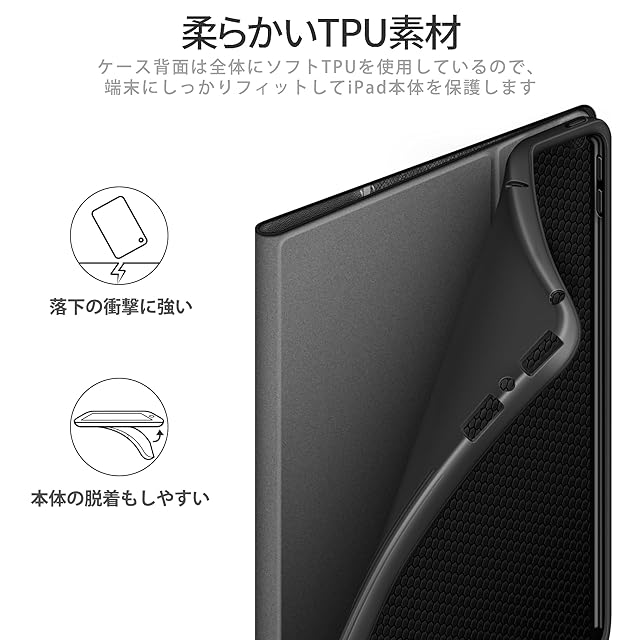 【耐衝撃】高柔軟性があるTPU、耐久性に優れたPUレザーなどの素材採用しており本体を優しく守ります。iPadケースとカメラやディスプレイに高低差があり、高いところから落とした場合でもiPadへの衝撃を吸収し、液晶画面が割れないよう設計されています。