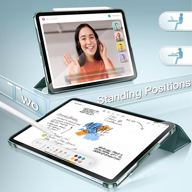 マグネット内蔵、オートスリープとオートウェイクアップ機能が付きます。三つ折りフロントカバーにより、視聴とタイピングに合わせた2つスタンド角度を調整できます