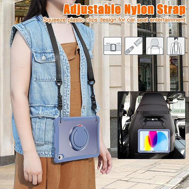 縦置き 横置き iPad 10 2022/iPad 11 2025ケース 肩掛け 360°回転持ち手 ペン収納 iPad第10世代 iPad 第11世代 カバー ショルダーストラップ付き ハードPC +シリコン リングスタンド 耐衝撃 半透明 背面カバー つや消し, 紫灰 | AVENIR
