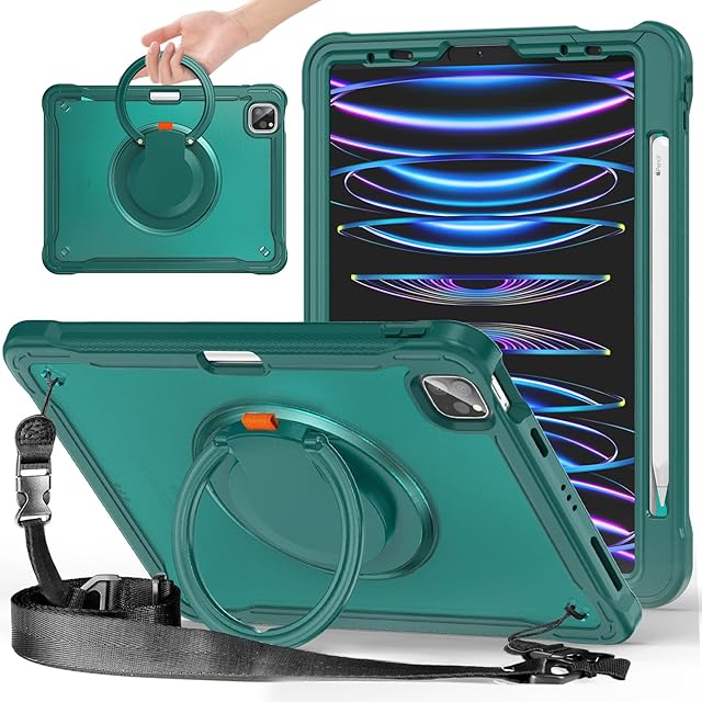 縦置き 横置き iPadPro12.9 ケース 肩掛け 360°回転持ち手 ペン収納 iPad Pro 12.9 インチ第 6 5 4 3 世代 カバー ショルダーストラップ付き ハードPC +シリコン リングスタンド 耐衝撃 半透明 背面カバー つや消し (iPad Pro12.9, 深緑)