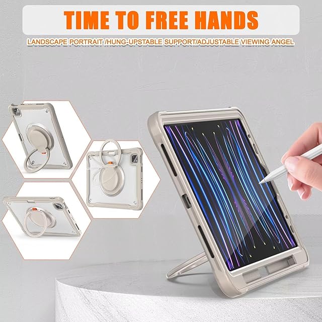 縦置き 横置き iPad Air 13 2025 2024 / iPadPro12.9 第 6 5 4 3 世代 ケース 肩掛け 360°回転持ち手 ペン収納 iPad Air 13インチM3 M2 カバー ショルダーストラップ付き ハードPC +シリコン リングスタンド 耐衝撃 半透明 背面カバー つや消し