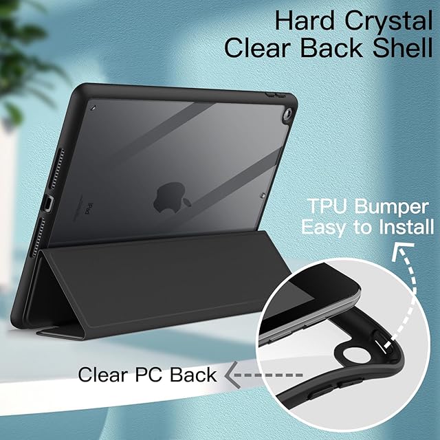 JETech iPad 10.2インチ ケース(第9/8/7世代、2021/2020/2019モデル用) Pencil収納可能 透明バックカバー 薄型 スタンド 衝撃吸収 タブレットカバー オートウェイク/スリープ機能 (ブラック)
