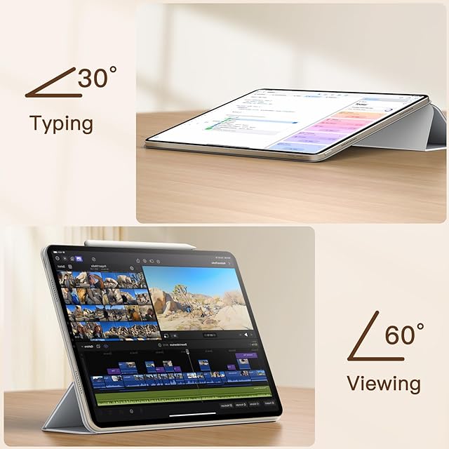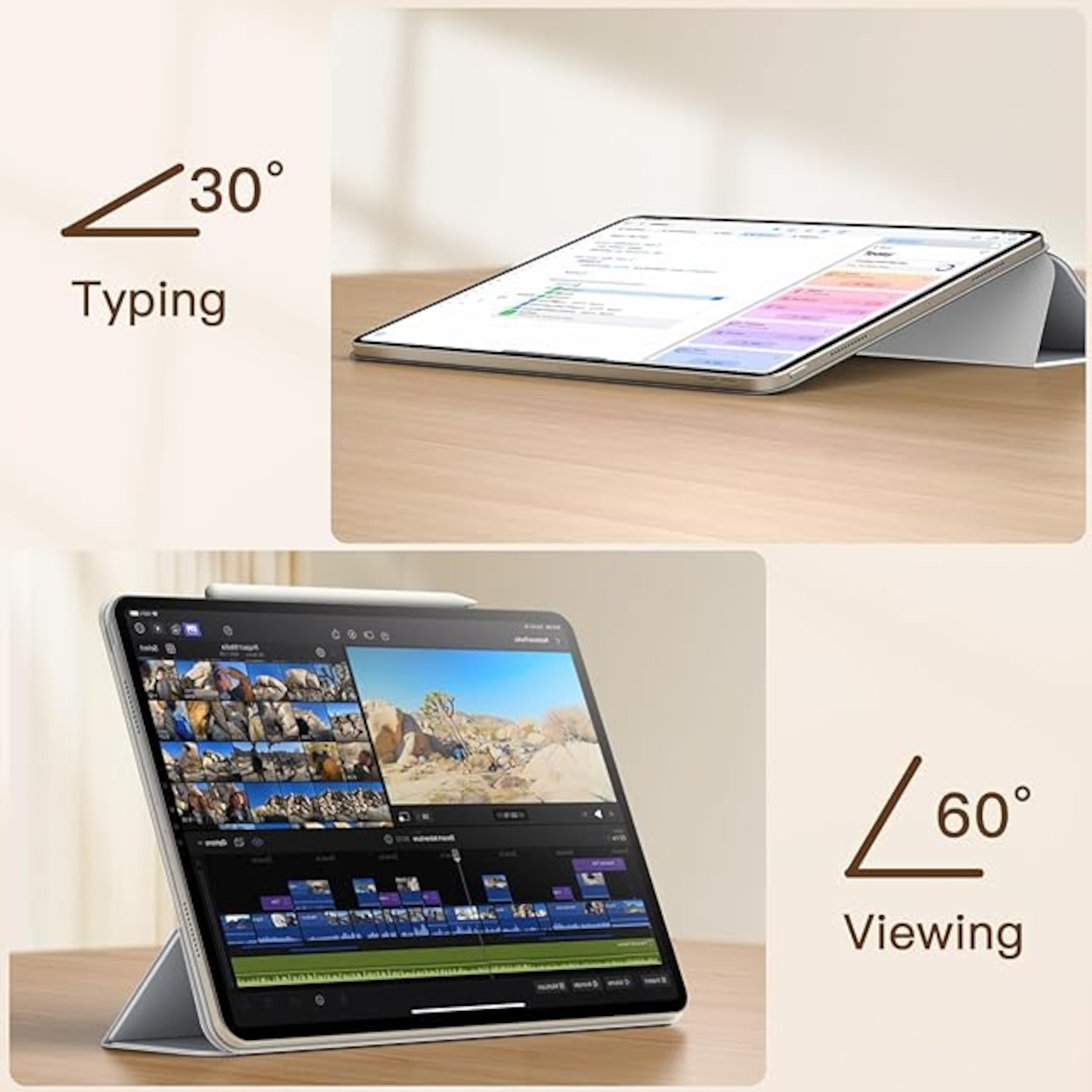 三つ折りフロントカバーにより、視聴とタイピングに合わせた2通りのスタンド角度を調整出来ます