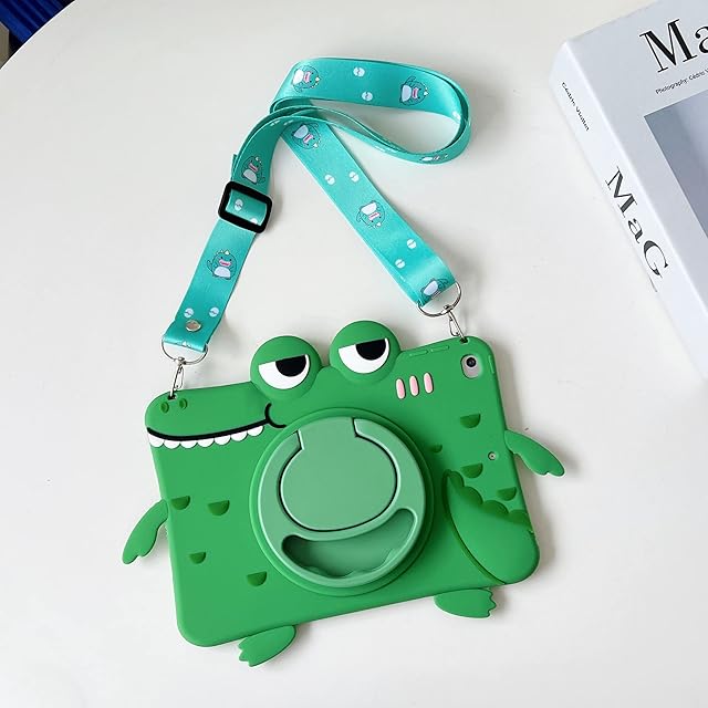 CrazyLemon 適用 iPad Air 2 ケース iPad Pro 9.7インチ 2016 ケース かわいい 360度回転 リング付き 縦置き 横置き スタンド機能 肩掛け ストラップ 付き かっこいい グリーン クロコダイル デザイン ソフト シリコーン アイパッド 保護ケース 耐衝撃 カバー 男性/女性 大人/子供 人気