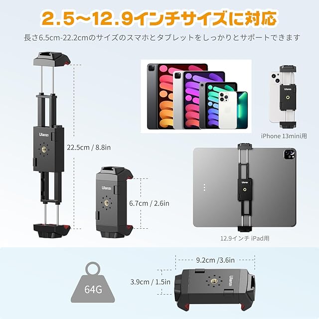 【ユニバーサル】両方向に調節可能な2イン1のスマホホルダー/タブレット三脚マウントアダプターの調整幅は65mm-222mmです。ホルダーは2.5~12.9インチの範囲内での使用に適用です。iPhone、iPad Mini、iPad、iPad Air、iPad Pro、Surface Go、ほとんどの携帯電話やタブレット端末の縦置き、横置きにサポートします。* 12.9インチ以上のタブレットを横方向でのみサポートします。