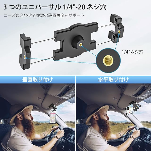 車載ホルダー サンバイザー タブレットホルダー 強力クリップ式スマホホルダー 360度回転 しっかり固定 自由雲台 1/4ネジ付き 多機能 カメラ/iPadスタンド 4.7-12.9インチ全機種対応 厚いケース対応 iPad Pro 9.7 10.5 11 インチ/iPad Air Mini/Samsung Tab/Kindle/iPhone/Android/Switch/, GoPro/Canon/webカメラ/アクションカメラ など
