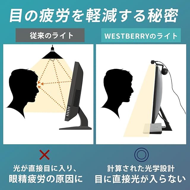 【目の負担軽減】明るさを手元に集中、スクリーンの反射はゼロ。目へ直接はいる光をなくし、間接照明のように目に優しいライト。