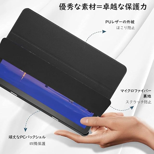 「上質な素材採用」 タブレット表面はPUレザー素材を採用しており、手触りが良くて、且つハードなPC製バックケースがあり、不意の扱いによる落下時の衝撃を有効的最小限に抑えられて、タブレット本体を傷つきや汚れからしっかりと保護できます。無色透明な設計で、タブレット本来を美しさを遮らず、完全に引き立てます。