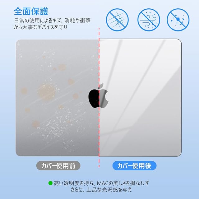 【取り付け簡単】トップカバーとボトムカバーは分離型な設計より、取り付け方が簡単です。機器と向きを合わせて、パチンと音がなるまで押し付けば、取り付けは完了です。何度開閉してもMacBook本体の邪魔になりません。