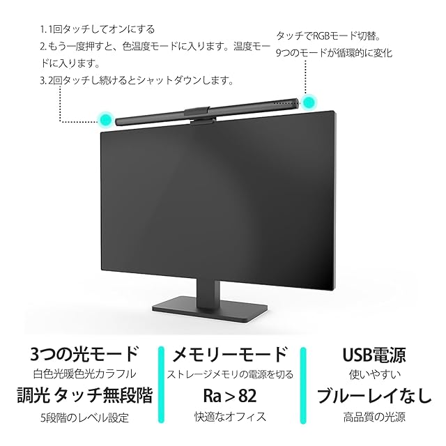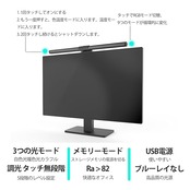 [無段階調光・メモリー機能] モニターライトはタッチセンサー技術を採用し、バーライト両側のタッチセンサーで明るさを自由に調整でき、光色も簡単に切り替えられます。 ディスプレイライトはメモリー機能を搭載しており、調整したライトパターンを再現することができ、お気に入りのライトパターンを記憶することができます。