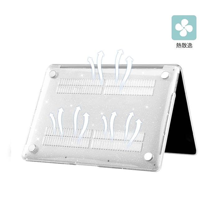 通気と放熱 - 透明な保護ケースの底面にある通気孔は、効果的な放熱をサポートし、過熱を防ぎます。これにより、長時間の使用や高負荷作業でも安定したパフォーマンスが維持されます。旅行、通勤、学校、オフィスなど、あらゆる場面で安心してMacBookを使用できます