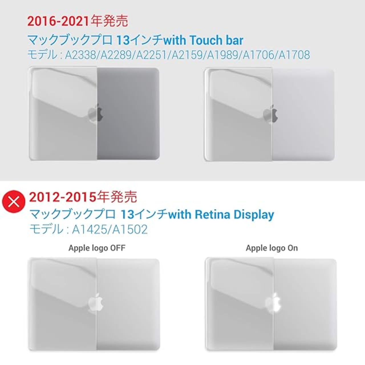❺【ご注意】2016年以前に発売された旧型のMacBook Pro(モデル: A1502/A1425/A1278)にはこのケースの対応機種でない*機種によりデザイン縮尺が若干異なります。ご利用のMacBookが対応モデルである事を再度確認ください。