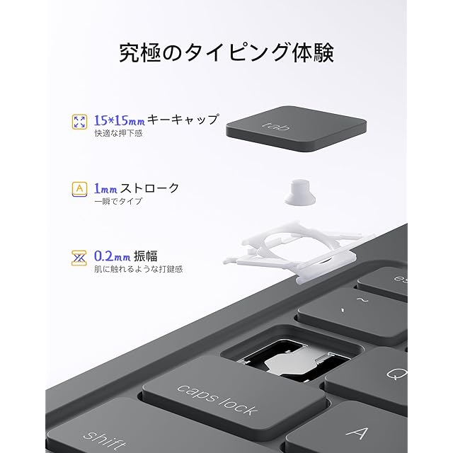 便利なショートカットキー:6行のキーで構成される革新的なキーボードは一番上の行が専用のショートカットキーです。ワンクリックで画面をロックしたり、音量を調節したりすることができ、複雑なキーコンビネーションを避けることもできます。15mm×15mmのキーは、ラップトップと同様の快適なタイピング体験を提供します