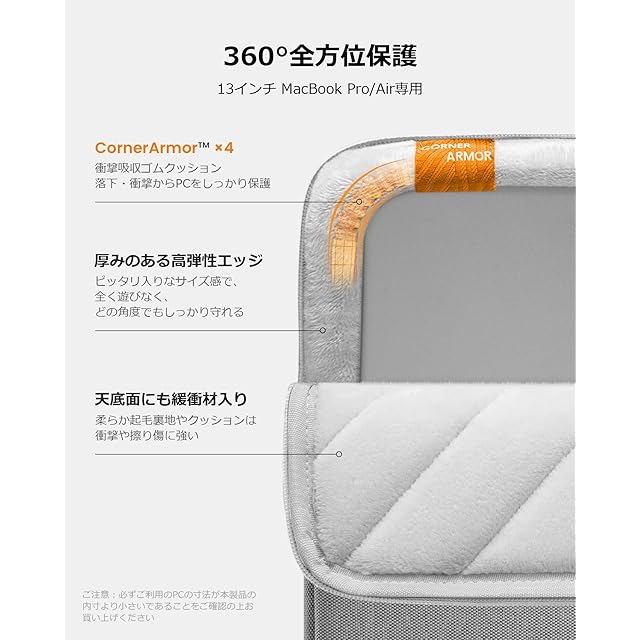 tomtoc 360°耐衝撃 パソコンケース 13インチ MacBook Air M4/M3/M2/M1 2025-2018/13型 MacBook Pro M2/M1 2024-2016対応 保護 スリーブ ノートPCインナーバッグ ガジェットポーチ グレー | AVENIR