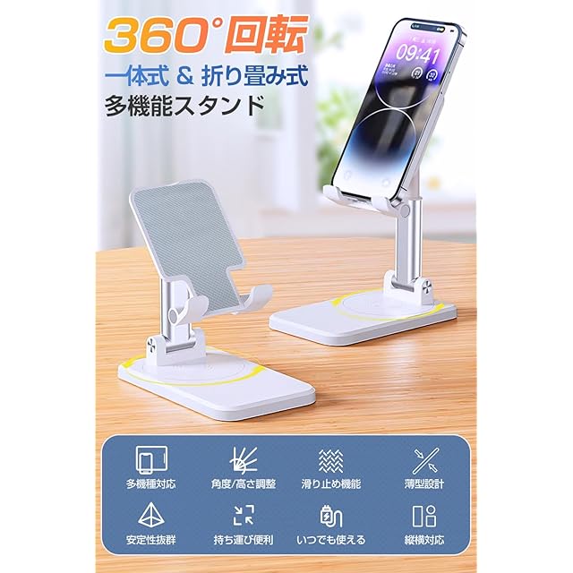 ★360度回転できるスタンド★ ■手で軽く回すだけで、向かい合う相手と画面を共有できます。 ■スマホだけでなく、横置きのタブレットにも使用することができます。 ■幅広い汎用性、多機能&安定なスタンド、4~12.9インチまでのデバイスに適用! ■手帳型ケースを付けたままでも使える、12mmまでのデバイスに対応できます。