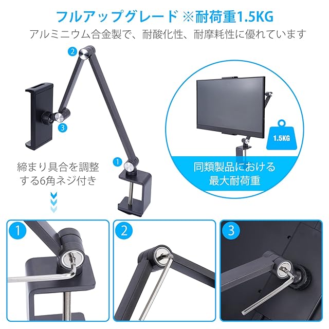 【4.7~17.3インチ対応】ホルダー部の長さは12.5~25.5㎝まで伸縮、ほとんどの4.7-17.3インチのスマホ、タブレット、モバイルモニターに対応できます。耐荷重は1.5kgです,同類製品における最大耐荷重。ご注意:15.6/17.3インチのモニター用に購入される場合、ベゼルを含めたモニターの幅(外寸)を必ずご確認ください!幅25.5cm、厚1.4cm以内は対応可能です。なお、VESA規格でねじ止めするタイプの通常のPCモニターは厚みがあるため装着できないです。
