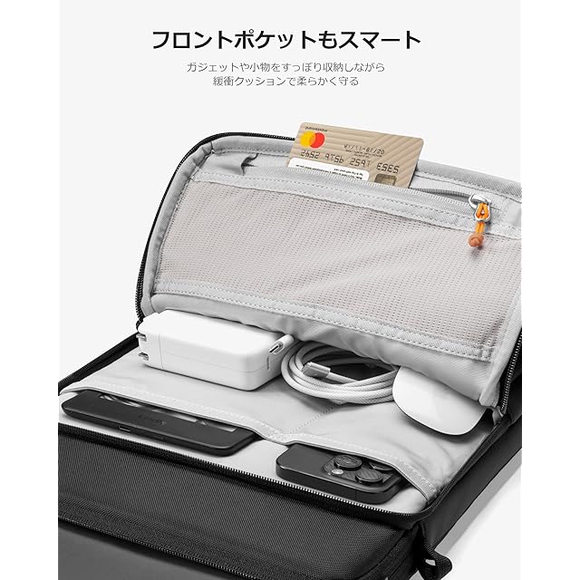 【大容量でスマート収納】スマートデザインのフロントポケットは多様な仕切りが備わり、充電器、ケーブル、マウスなどのPC周辺機器、ペン、スマホをスッキリ・一気に整理・収納できます。その中にジッパー型メッシュポケットは重要なビジネスアイテムの収納に最適。