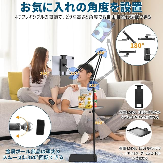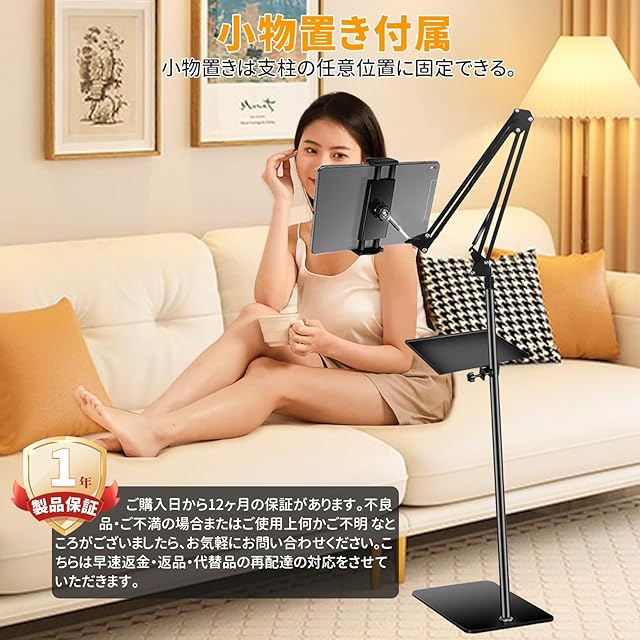 【小物置き付き タブレットスタンド】寝室での動画鑑賞、YouTubeを見て、在宅勤務、オンライン授業など、どんな場所でもご好みのように使用可能です。小物置きも付属し、耐荷重は1.5kg、モバイルバッテリー、イヤフォン、ゲームハンドル、コーヒー、おやつなど置けることができます。小物置きは支柱の任意位置にネジで簡単に固定でき、不用の時に取り外して良いです。本タブレットスタンドは貴方の両手を完全に解放させ、ベッドに寝ながらリラック時間を楽しめます。