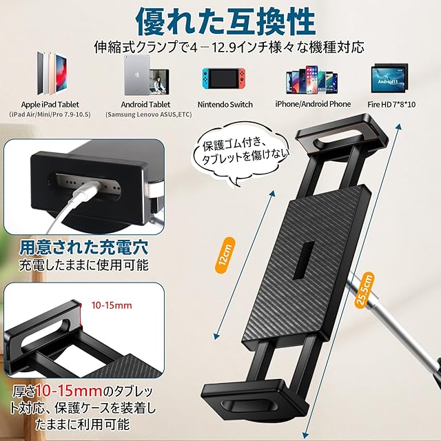 【4.5-12.9インチ機種対応・充電穴用意】ipad スタンド の伸縮式クリップにより、12-26cmまで拡張可能し、4.5-12.9インチの全てiPad/iPadPro/iPhone/android/surface/Kindle/Fire HD8/Switch などさまざまな機種に対応します。寝室での動画鑑賞、YouTubeを見て、在宅勤務、オンライン授業など、どんな場所でもご好みのように使用可能です。それ以外、クリップ両側は充電穴を用意されて充電したままに利用可能します。また、クリップは1.5cm厚さのタブレットが対応し、保護ケースを装着したままに利用可能です。