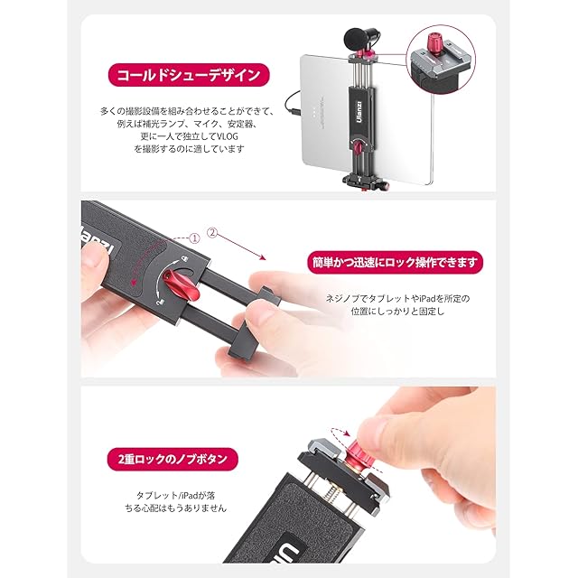 Ulanzi タブレットホルダー 三脚用 ipadホルダー 金属製 7.9-12.9 インチ iPadブラケット 2つアルカスイス ゴールドシュー付き iPad iPad iPad mini iPad Air iPad Pro 7.9'' 9.7'' 10.2'' 10.5'' 10.9'' 11'' 12.9'' iPhone/Galaxy Tab 用の iPad クリップ 支持10-23cm幅 調整可能 ホットシューマウント1/4インチネジとAcra Swiss( アルカスイス)レール付き ipad | AVENIR