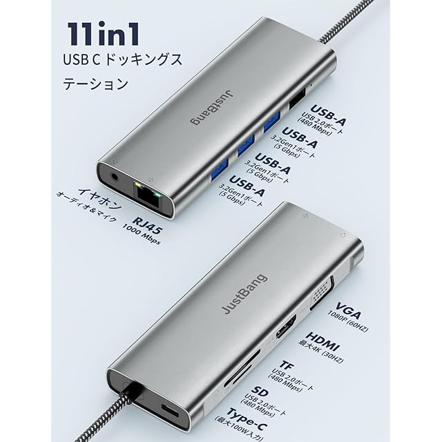 【多機能USB-Cドッキングステーション&11ポート&長めのケーブル】このUSB-Cドッキングステーションは、1つの4K HDMIポート、1つの1080P VGAポート(60Hz)、1Gbps対応のRJ45 LANポート、100W PD対応のUSB-C充電ポート、microSD&SDカードスロット、3つのUSB-A 3.0ポート、1つのUSB-A 2.0ポート、そして3.5mmオーディオポートを搭載しています。これ一つで複数のデバイスを接続でき、マルチディスプレイアダプタとしても便利です。Thunderbolt 3/4にも対応しており、さまざまなデバイスに対応するUSB Type-Cハブ映像出力対応です。