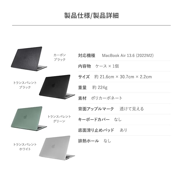 【製品仕様】… ◆ 対応機種 : Apple MacBookAir 13.6 2023 M2 / 2024 M3 ( マックブック エアー 13.6インチ ) ◆ 内容物 : ケース × 1個 ◆ サイズ : 約 21.6cm × 30.7cm × 2.2cm ◆ 重量 : 約 224g ◆ 素材 : ポリカーボネート