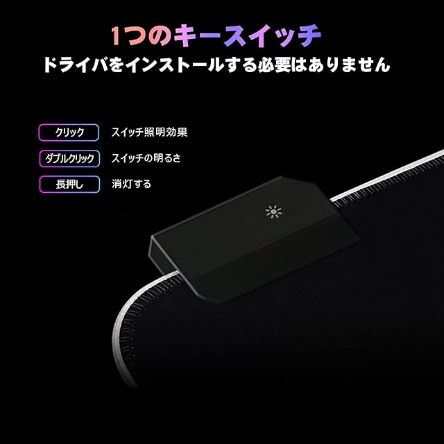 【ワンボタンでライト変換機能】ライト切り替え用のRGBコントロールスイッチで、14セットのRGBライトモードと二種ライト明るさの中お好みのモードに 切り替え、ゲーム部屋の雰囲気を強調。スイッチキー機能:①スイッチをクリックし、14組RGBライトモード切り替えできます。②スイッチをダブルクリックし、二種ライト明るさコントラストが調整可能。③スイッチを3秒間長押し、ライトを消す。もう一度押すだけでライトをつける。④パターン記憶型となります。電源をOFFにしても、前回のパターンを記憶し、ON時に前回のパターンで点灯。