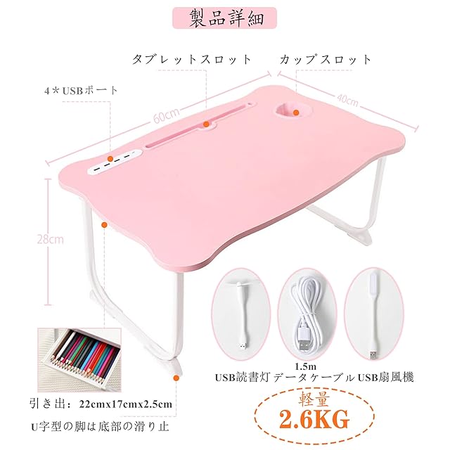 ❤【多機能折りたたみテーブル】読書灯とファンが付属しています、折りたたみテ ーブルには、4*USBポート・スマホスタンドスロット。このカップスロットとスマホスタンド、折りたたみテーブルを自宅で仕事や勉強に使う時にとても便利なデザインです。テーブルの下の収納引き出しには、筆記用具やイヤホン、ケーブル、SDカードなどの収納に便利です。