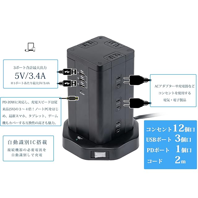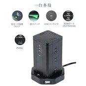TOP-FLEX タワー式電源タップ 12AC充電口(110-125V)+4USBポート(最大3.4A/5V)雷ガード 過負荷保護 省エネ PSE認証済 延長コード2m オフィス/家庭給電用 (Black) | AVENIR