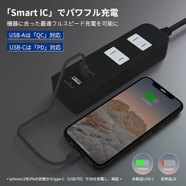 「急速充電規格PD・QC対応」2種類のUSBポート(Type-C・USB-A)であらゆる機器の充電に対応。最新機器もアダプタなしで充電でき、見た目もスッキリ。Type-CはPD20W対応でiPhone充電におすすめ。 USB-AはQC3.0対応でAndroid充電におすすめ。内臓のスマートICシステムが接続機器を自動検知して最適な充電を行い、過電流や過充電を防いでくれます。デバイスのバッテリーやケーブルの劣化を軽減するから、毎日使う機器の充電にオススメ。※複数ポート使用の場合は最大17W充電。PD20W・QC3.0対応機器は単一ポートでの充電を推奨。