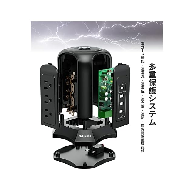 【多重保護システム】このタワー型電源タップは雷ガードを内蔵しており、恐ろしい雷から機器をガードすることに加えて、ブレーカーを内蔵しており、接続している機器の消費電力の合計が1500Wを超えた場合、ブレーカーが作動し電源が切れます。そして、シェル素材は難燃ABS樹脂とPC94V0より作られて、耐火性は750℃に達します。更に過電流、過電圧、過充電、過熱など多重保護を搭載しており、お客様の安全とお使いの家電をお守りできます。