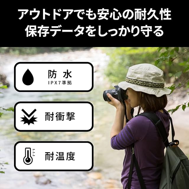 高い耐久性を備えているので、落ち運びの際のもしものトラブルでもデータ破損のリスクを低減します。防水仕様はIPX7等級準拠なので、万が一の水没からもデータを守ります。耐X線:ISO7816-1準拠.
