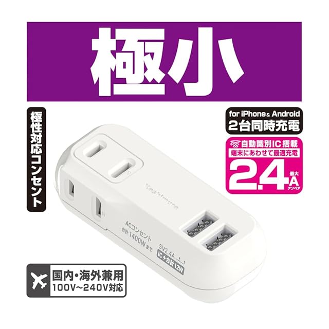 仕様: 入力電圧:AC100V-240V 50/60Hz / 出力:ACコンセント3口合計 1400W / 出力:USBポート2ポート合計 最大DC5V/2.4A / コード長:1m / 本体サイズ/重量:45W x 95H x 25D(mm) /180g