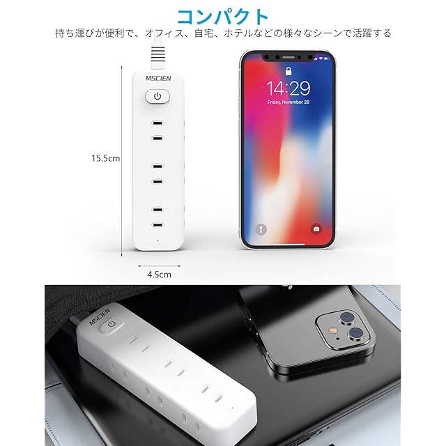 「干渉しない・スイングプラグ・一括スイッチ」:3面にはAC差込口が3口ずつあり、口間の距離が適切なので、ACアダプタが互いに干渉しません。スイングプラグは180°回転できるので、狭いスペースでも配線しやすいです。一括集中スイッチ付きで、電力を節約するだけでなく、便利です。