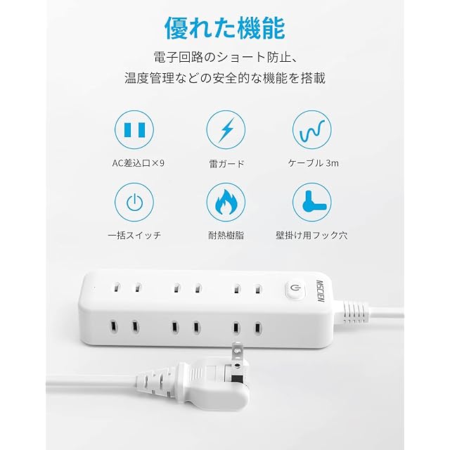 「一台9役・3m延長コード」:便利な9個AC差込口を備えた小型マルチタップです。AC差込口の数は多く、出力が最大1500Wで、複数の家電を接続することができます。電源タップは小型で、スペースを取りません。延長コードは3mで、用途が広くて、使用が便利です。