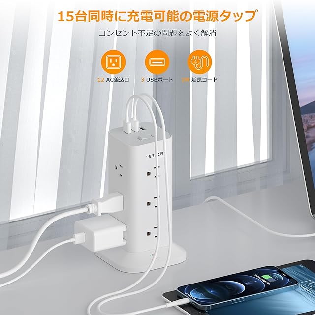【1台15役 タワー型電源タップ usb付き】このusbタップは12個のACコンセントと3つのUSBポートが搭載されており、一度に複数のデバイスを同時に充電可能です。USBポートにはスマートチップを内蔵し、自動で検知して最適な電流を供給。家庭でもオフィスでもとても便利です。